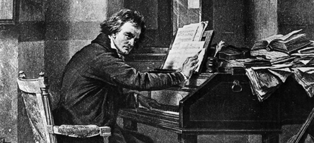 We went one afternoon to the Alservorstadt, and mounted to the second storey of the so-called Schwarzspanier house. We rang, none answered; we lifted the latch, the door was open, the ante-room empty. We knocked at the door of Beethoven’s room, and receiving no reply, repeated our knock more loudly. But we got no answer, although we could hear there was someone inside. We entered, and what a scene presented itself! The wall facing us was hung with huge sheets of paper covered with charcoal marks; Beethoven was standing before it, with his back turned towards us, but in what a condition! Oppressed by the excessive heat, he had divested himself of everything but his shirt, and was busily employed writing notes on the wall with a lead pencil, beating time and striking a few chords on his stringless pianoforte. He did not once turn towards the door. We looked at each other in amused perplexity. It was no use trying to attract the deaf master’s attention by making a noise; and he would have felt embarrassed had we gone up to him. I said to Atterbom, ‘Would you, as a poet, like to take away with you to the north the consciousness of having, perhaps, arrested the loftiest flights of genius? You can at least say, “I have seen Beethoven create.” Let us