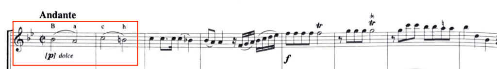 What does it look and sound like? Below is the first line played by the oboe in the second movement, starting with the B-A-C-H motif (click on the sound file to hear the notes printed, listen to the oboe).